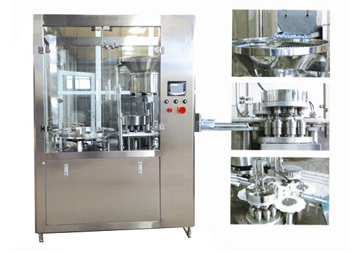 設備由架體、轉盤、進出瓶拔輪、鋁蓋下蓋系統、下瓶托、上壓頭、圓刀和電器控制系統等幾個部分組成。
